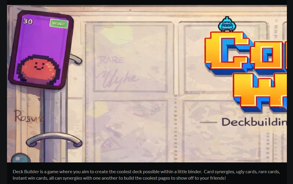 Deck Builder is a game where you aim to create the coolest deck possible within a little binder. Card synergies, ugly cards, rare cards, instant win cards, all can synergies with one another to build the coolest pages to show off to your friends!